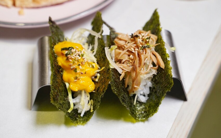 素海膽手捲、香椿杏鮑菇手捲做工很精細,吃起來層次感豐富。
