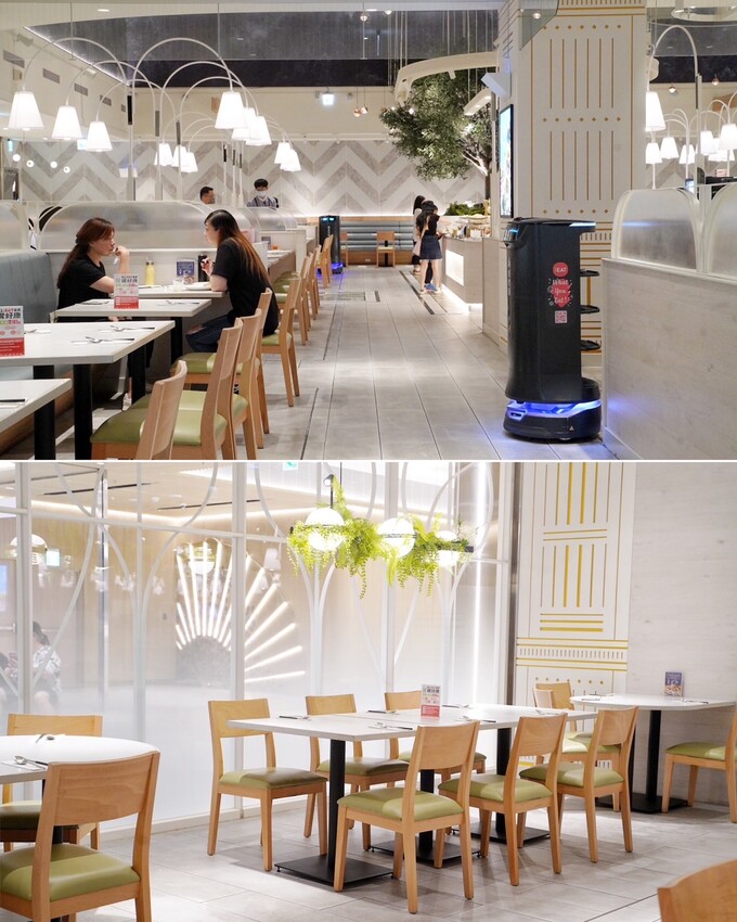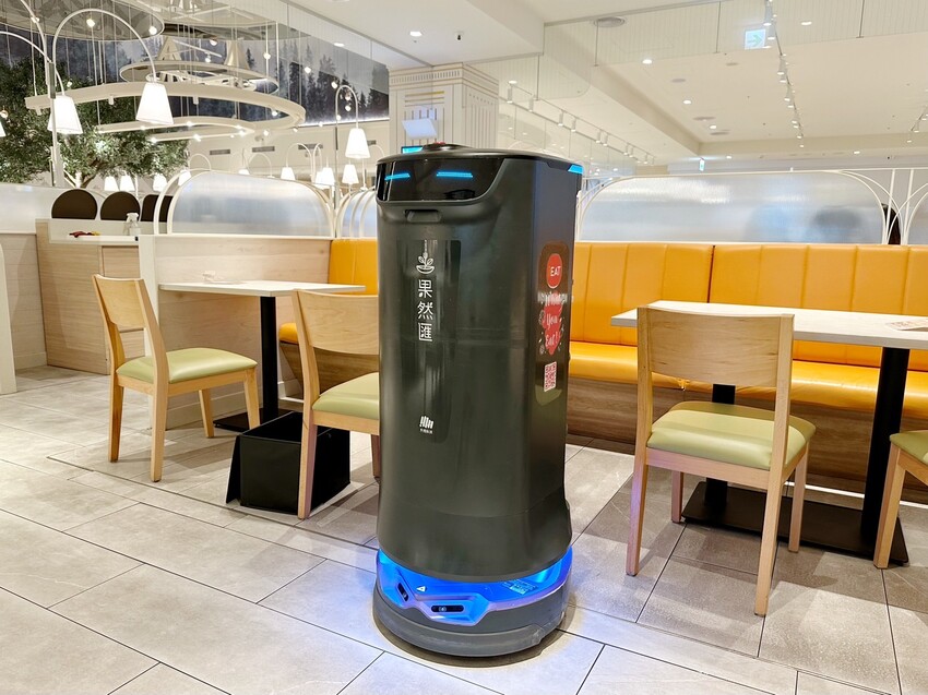 「果然匯」送餐機器人是專門用來回收餐盤,看到他經過就可以隨手把桌上用過的餐盤擺上去。