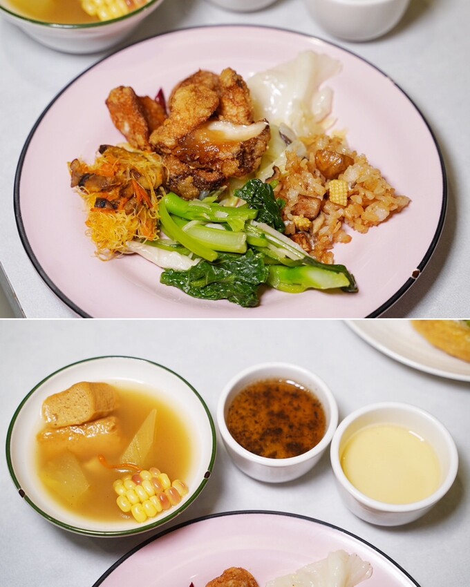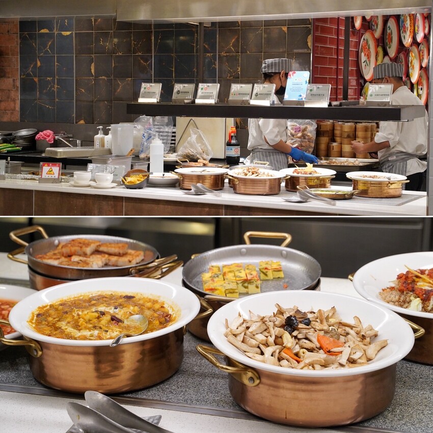 蒸籠區有黑芝麻流沙包、南瓜菇菇包、香椿什錦蒸餃、蜂蜜桂花糕、芋絲糕。湯品部分則有佛手瓜皇帝蟲草燉湯、素食佛跳牆、田園五行薏仁粥。