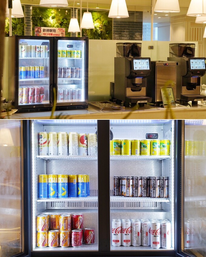 飲料區有現打蔬果汁、罐裝飲料、牛奶咖啡機、豆奶咖啡機、茶包。
