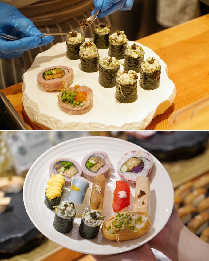 日式料理區有現握壽司、現做手捲、蒸物、炸物、烤物,壽司手捲種類就有將近10種選擇,辛豆乳甜椒握壽司、三日苗捲壽司、芋泥烤麩壽司、紅藜麥壽司、炙燒番茄握壽司、酪梨稻荷壽司、素海膽手捲、香椿杏鮑菇手捲等等,都是以新鮮蔬果為食材,不使用加工素料,日本職人料理手法製作。