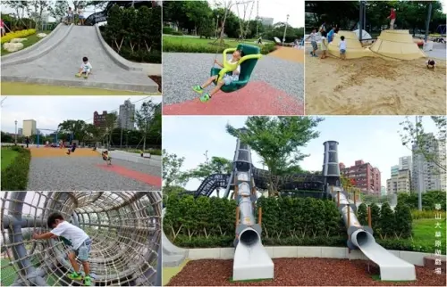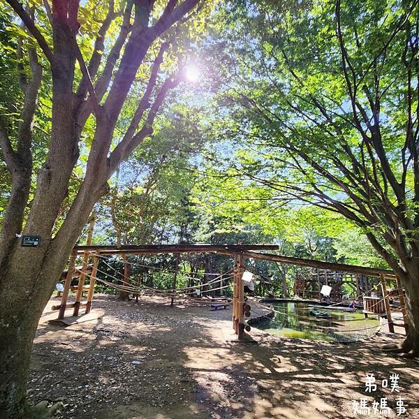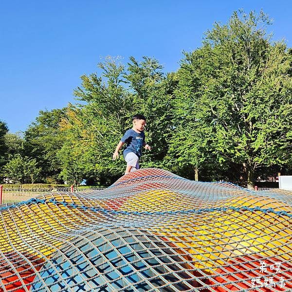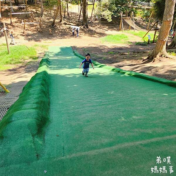 弟噗媽先說,如果從剛剛血拚的粉紅社區中心要回到玩水區、溜滑梯區,只要穿過風車,再走過一座很高、能夠看片整個園區的橋,直直走過去就到玩水、溜滑梯區,也能到這個體能挑戰區。