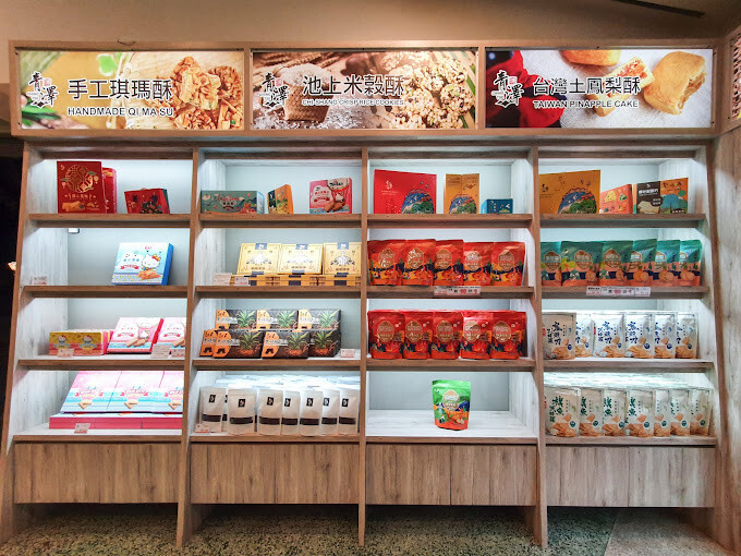 貨架上陳列的就是青澤各種不同的伴手禮,除了知名的琪瑪酥,還有池上米穀酥和土鳳梨酥等