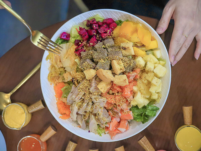 挑蛋白質 : 目前共有10多種項目可選,雞胸、雞腿、水煮蛋、生食級鮭魚、章魚花枝、骰子牛等多樣蛋白質,同樣可以追加,每多一份是+$22。