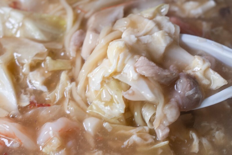 湯頭的確有大滷麵的味道、尤其是口感,什錦麵的鍋氣有,但不甚明顯,最秒的是偏酸的主味,有一點像酸辣湯,又或是加了很多醋的大鹹麵。蛋液頗滑口,高麗菜爽脆,蝦仁雖不大但蠻新鮮的,其他食材都切得比較小、比較細,吃起來比較沒有口感,興許是附近的主要客源都年紀大一點的,口感端比較偏軟些,但大抵上來說我是喜歡的。