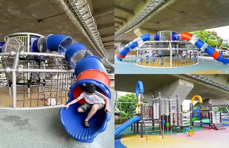 番仔溝公園》橋下機器人全齡遊戲場!無論晴雨天都能玩、飛碟多功能溜滑梯、沙坑、三人跳格子|嘉義親子景點