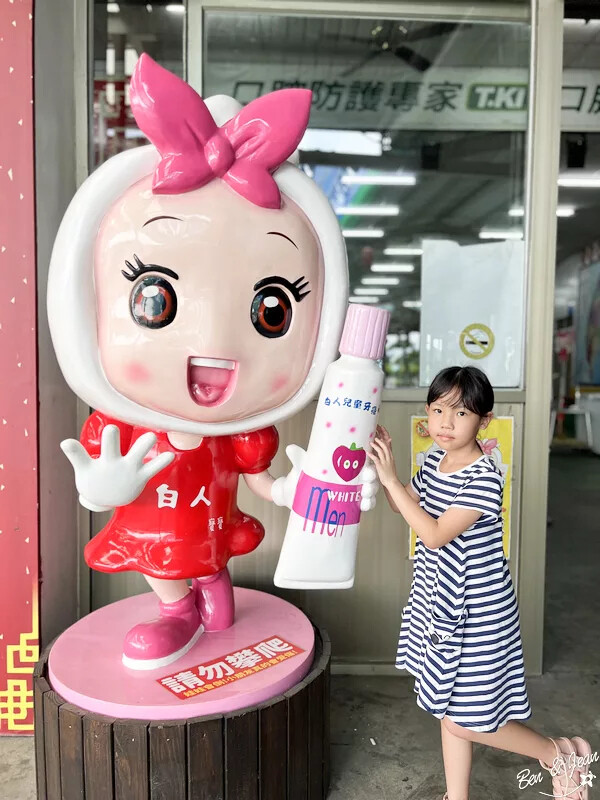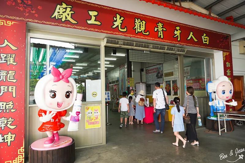 這裏不用門票就能進場參觀,觀光工廠門口有兩個可愛的公仔娃娃,一個拿牙膏,一個拿牙刷