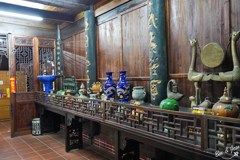 整棟建築採取古式精細栓構建造方式,建材採用福杉木、樟木建構而成,每支圓柱均有青斗石為地基,採用中國南方四合院,地坪由前戲檯、中廳、後廳均承中國地理學步步高升之結構。主結構以福杉木圓柱88支,樟木做為橫樑,樑上並雕刻精美人物陪襯,均屬古代民間典故。