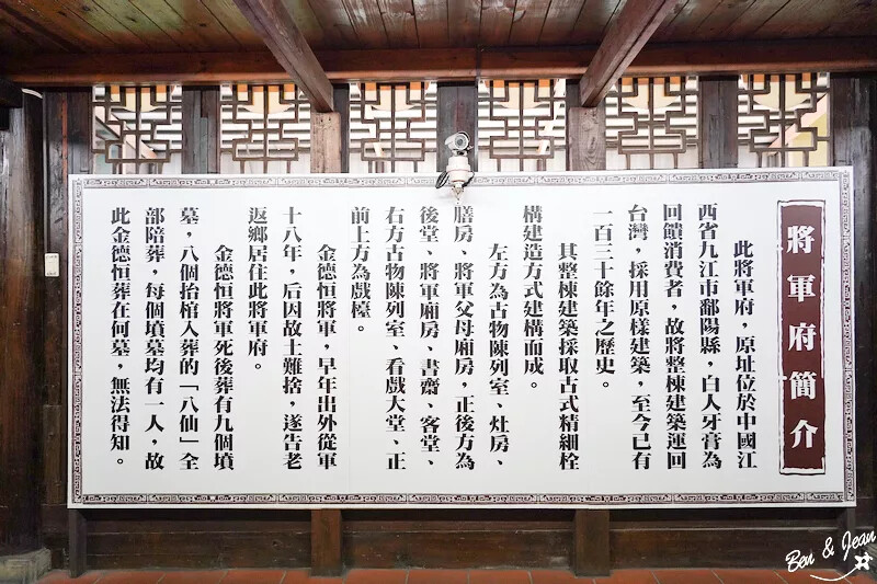 “「將軍府」原址位於中國江西省九江市鄱陽縣,建於大清光緒年間,是清朝金德恒將軍府第,至今已有一百三十餘年之歷史。白人牙膏為回饋民眾,並保存古物之歷史價值,於民國一百零一年遠渡從江西省原址,將整座將軍府拆卸,編號裝櫃運回台灣,再請原批當地師父來臺灣組裝呈現樣貌,以供國人觀賞,並維護古蹟”