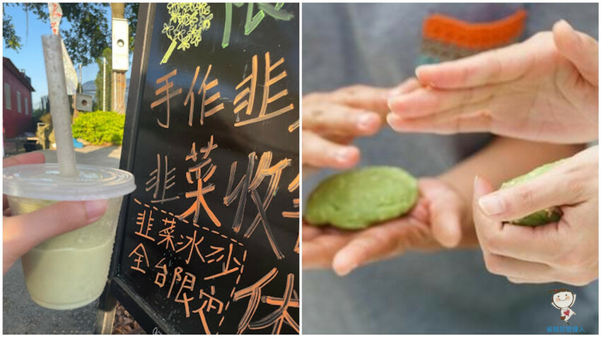 瞧瞧這杯全台限定的綠色韭菜冰沙,也是藍家友善農場才有販賣喔!