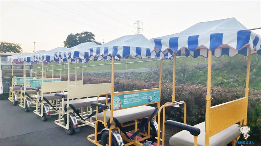 接駁車是把許多雙人座車連結起來,前面再由一輛引擎車來拉動