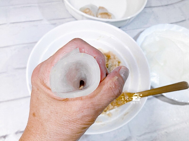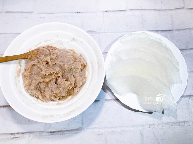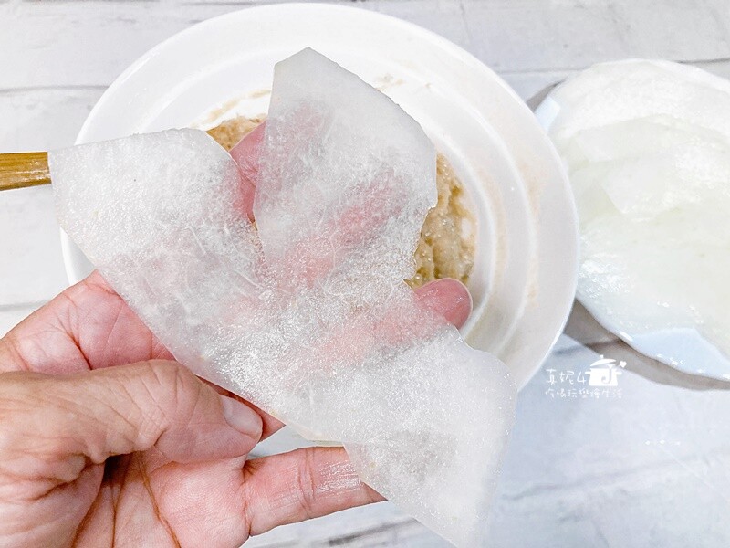 冬瓜片經過鹽醃出水後會呈現這種透明軟溜的狀態,就可以進行填餡包捲步驟