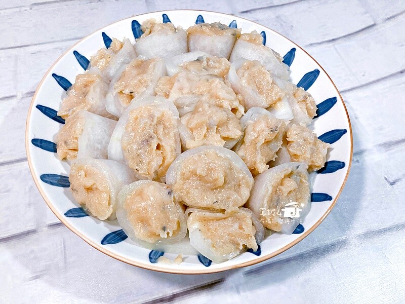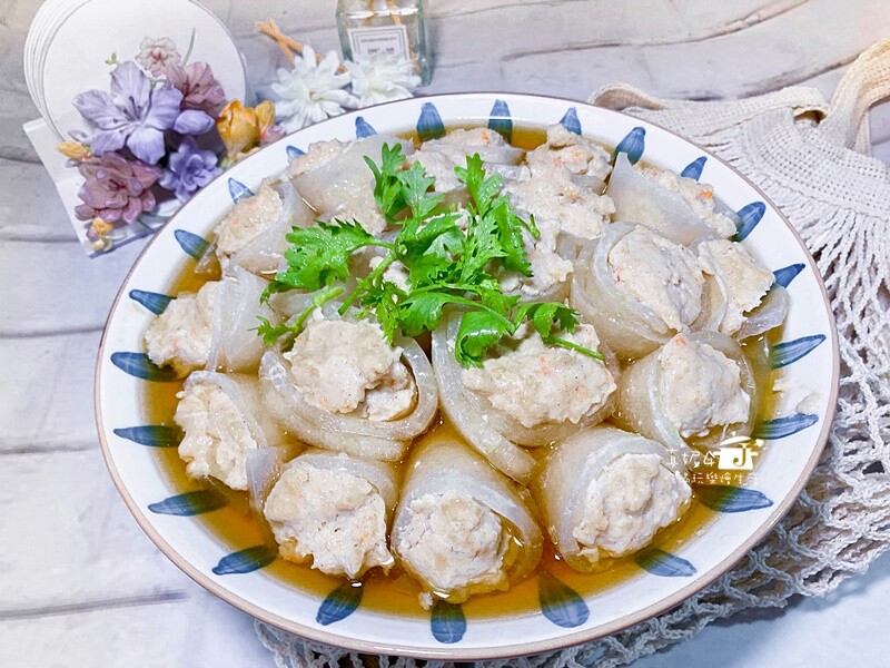 冬瓜肉捲,如白玉般晶瑩剔透的冬瓜面裡有著滿滿鮮甜的雞肉蝦肉泥
