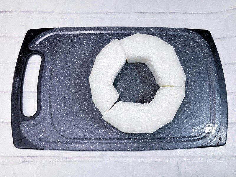 圓形冬瓜切三刀後,每段切出0.3cm的薄片