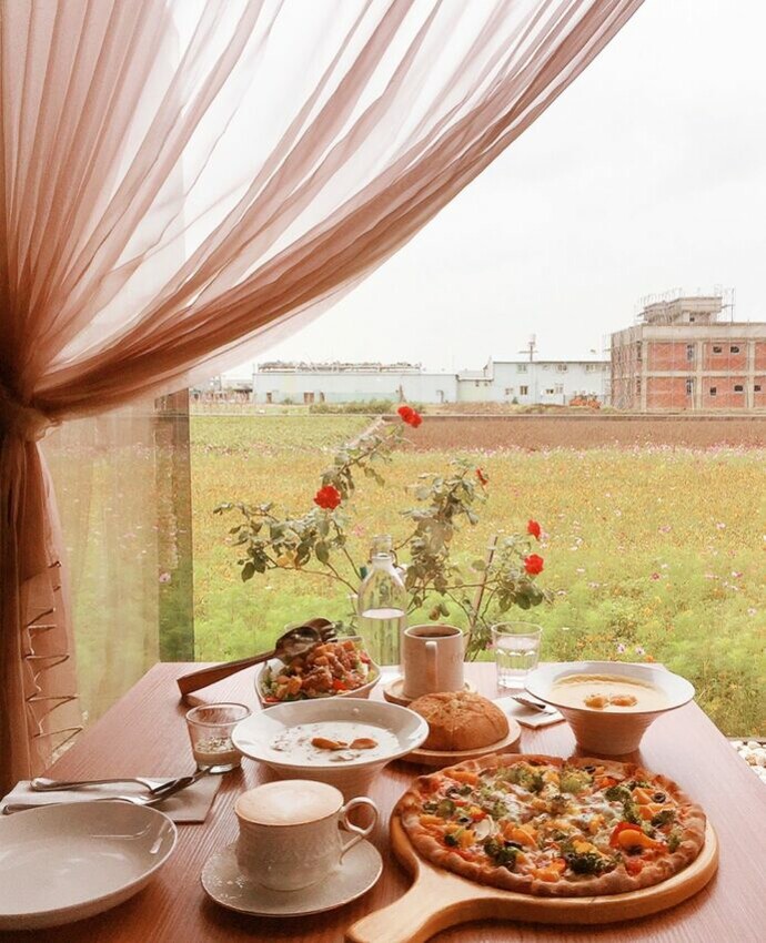 香草微風田園廚房是一間位在田園中間的餐廳,有可愛的小貓,餐廳外觀是一棟被翠綠田園包圍的黑框玻璃屋,內部挑高設計有質感,園內有很多美好植栽和多肉植物,整體設計很有層次感。餐點美味有特色,品質很好,食材選用新鮮、價格也合理,且選擇十分豐富,披薩、義大利麵、燉飯、排餐等通通有,很適合家庭或是朋友來這邊聚餐,坐在落地窗旁的沙發區,一邊用餐,一邊享受隔壁稻田美景~