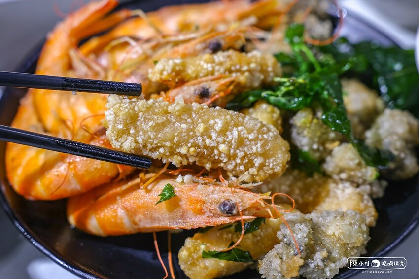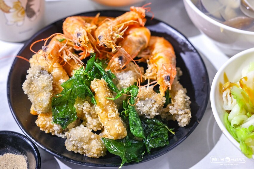 炸鮮蚵裹上一層薯粉油炸,搭配椒鹽就很美味,比較少有機會吃到的土魠魚快,魚肉細嫩,咬下去也不會乾口,炸白蝦的肉質鮮彈,自己加點辣粉提味,更好吃。