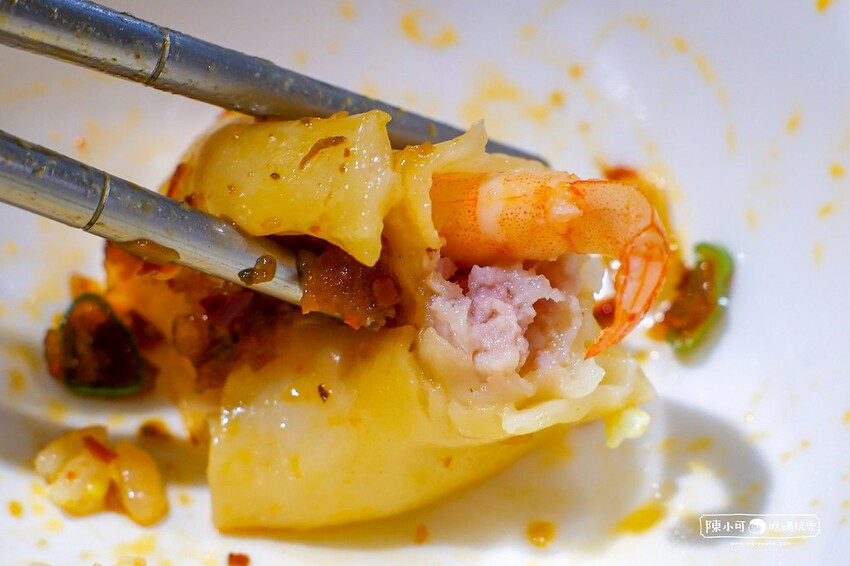 辣醬帶有微微的酸度、開胃爽口,加上彈牙的麵體,整碗口感真的還不賴呢!而抄手皮薄內餡紮實,蝦子也是整隻的。
