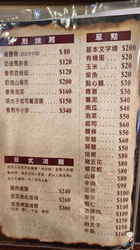 第四頁則以單點為主,還有日式燒麵和特殊的磯邊燒(日式烤年糕)