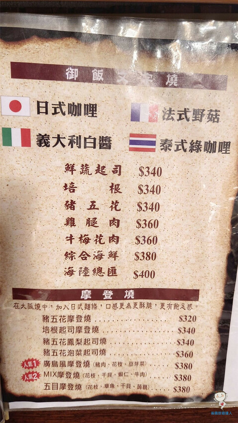 底下的摩登燒則是加了日式麵條,一樣有7種口味,價格$320~380,人氣最高的是廣島風摩登燒