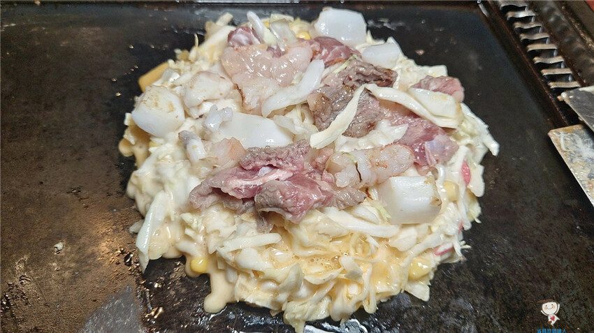 其實作法和大阪燒大同小異,但要先把材料煎成圓餅狀,之後再加麵條