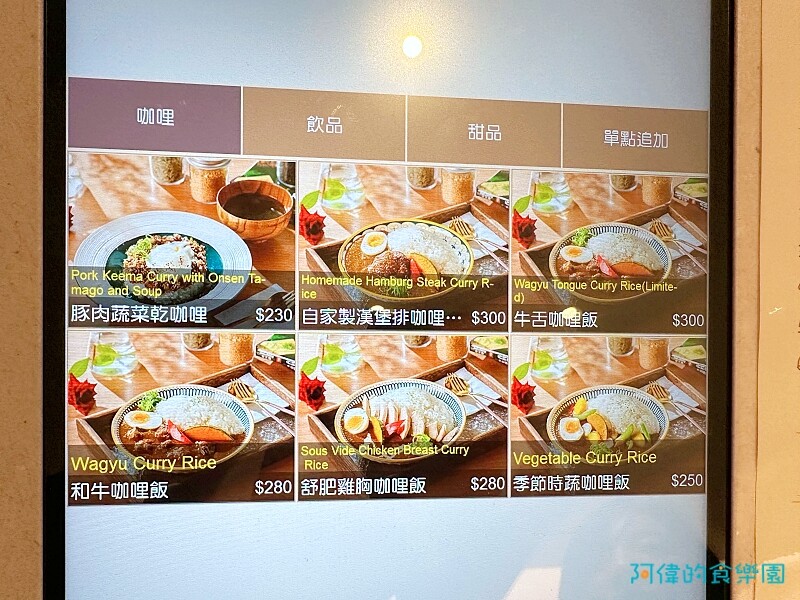 menu很簡單,除了和牛咖哩,不吃牛的人也可選舒肥雞胸、季節時蔬或是豚肉蔬菜乾咖哩。