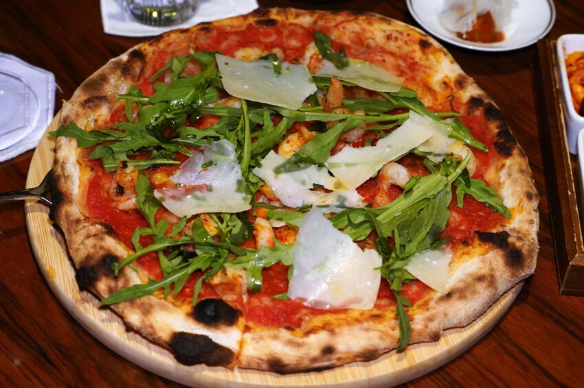 ▼大蝦披薩食材有番茄、大蒜蝦,芝麻菜、帕瑪森起司,是我喜歡的薄餅皮,外圍脆內部軟,乳香濃而溫順、鹹度適中,鮮美帶有水分的大蝦,水準超出預期。