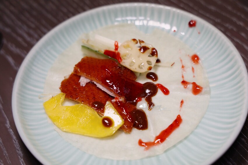 也可以搭配青雅中餐廳獨創的九宮格盤吃法,將配料像是百香果蘿蔔、蓮藕,然後發揮畢卡索的抽像畫般地,淋上紅梅醬、冰梅醬等,有如法國菜一般地高級,讓整個片鵝包餅吃起來口感清爽不油膩。