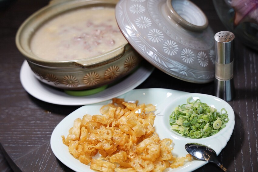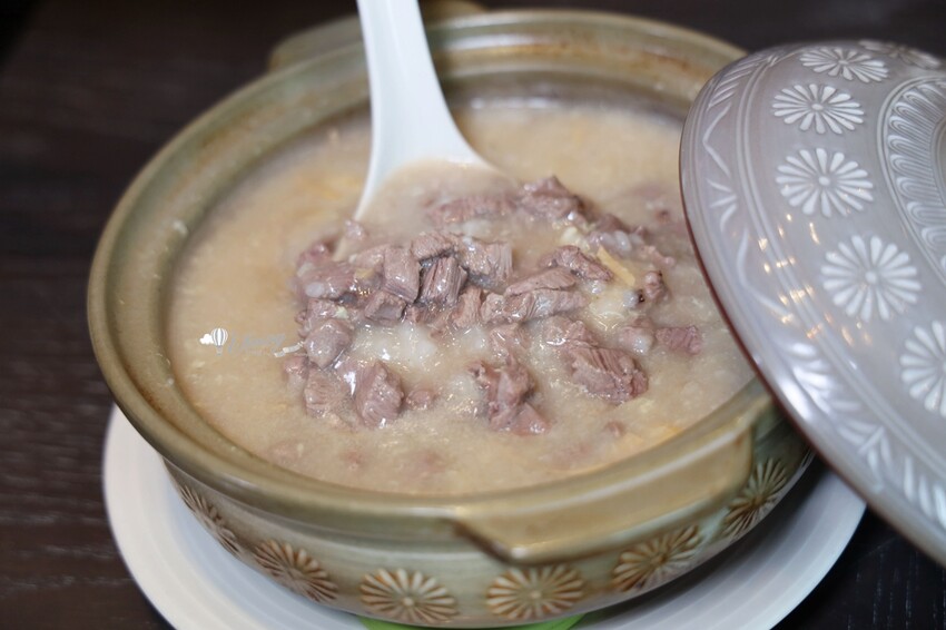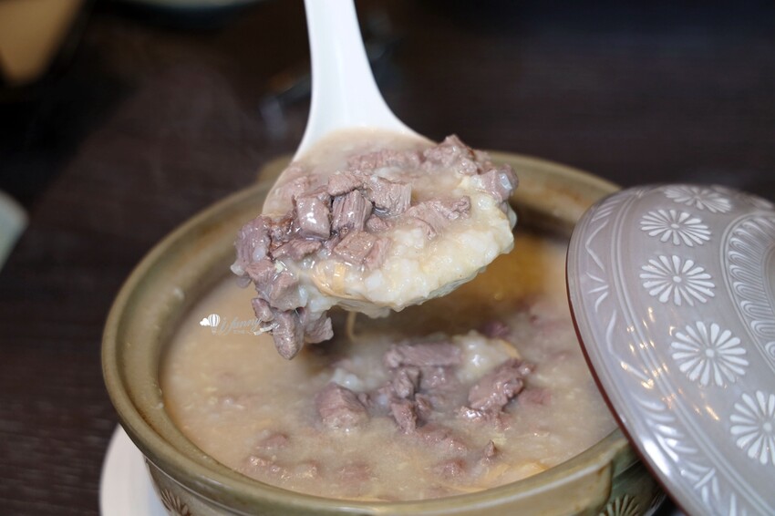 廚藝團隊使用鵝骨熬製的鮮甜高湯,先將鵝胸肉切成丁狀,再放入米、鵝胸肉、腐竹、薑絲、花菇絲等食材,一起放入鍋內熬煮,整體口感美味帶有鵝骨的香氣。