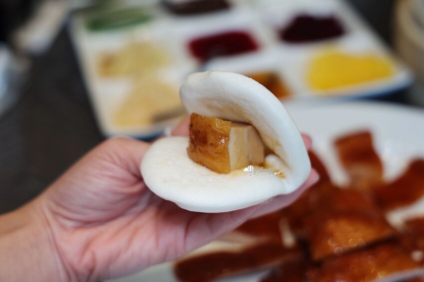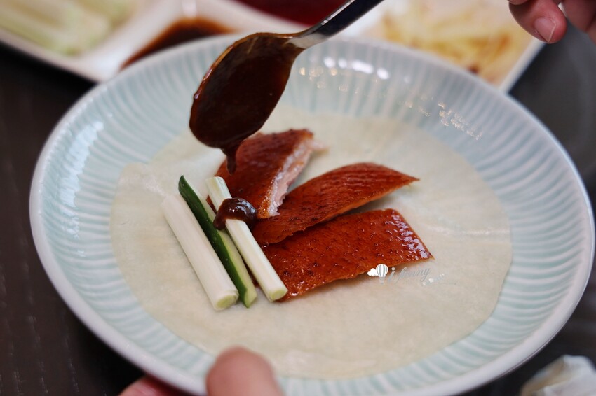 享用時可依個人喜好或傳統的方式,包入蔥段、小黃瓜及甜麵醬,就能吃到脆口油潤的滿口芳香。