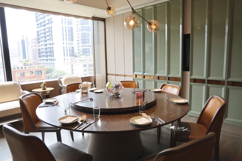 青雅中餐廳座位間的走道很寬敞,小沙發與靠牆貴妃椅的設置,與莫蘭迪綠為主色系的搭配,呈現古典細緻的美。