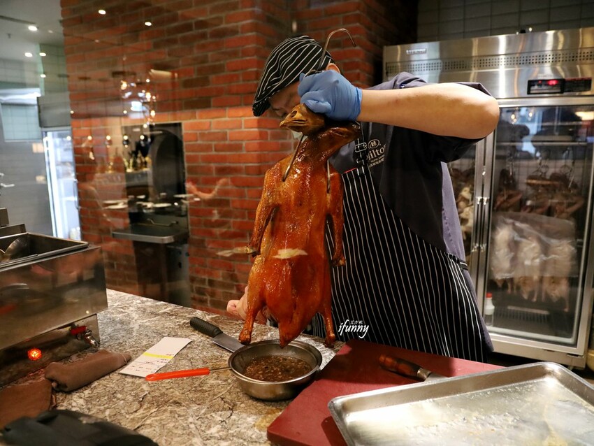 主廚依序將整隻鵝醃製過後,先利用熱水的高溫將整隻鵝燙過,使鵝皮緊實,再透過烘乾讓外皮更為酥脆。