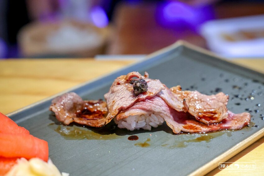 切成片狀的牛小排經過炙燒後,搭配松露醬做成握壽司,香嫩的肉質入口甜美。