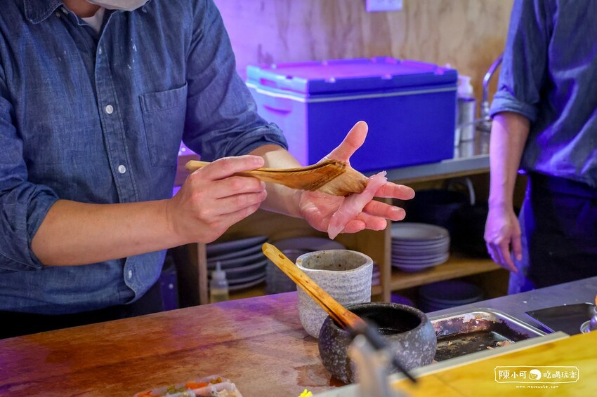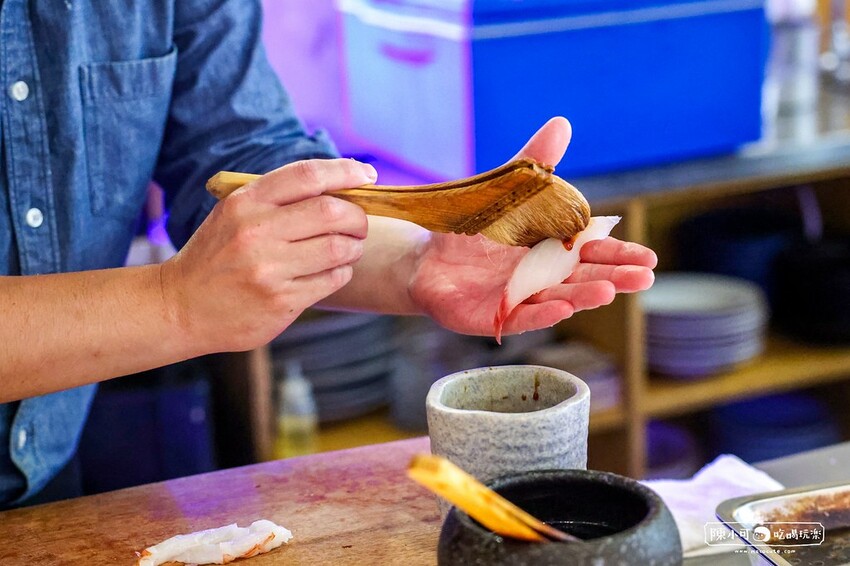 青衣魚又稱鸚哥魚,最常被用來做清蒸料理,但師傅提到生吃也很推薦,魚肉薄脆又Q、油脂少,搭配簡單的醬汁也能吃出魚肉本身的甜味。