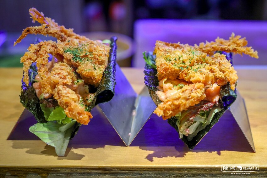 無菜單料理出現了軟蟹殼手捲,兩人份剛好一整隻,我之前就超想吃這個,沒想到就在「合掌村 忠孝2店」吃到囉٩(●ᴗ●)۶