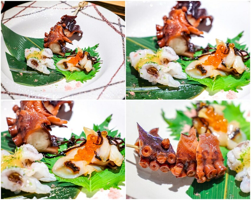 花枝鬚加入自製味增醋,爽脆又帶一點酸的風味,調味過的章魚飽滿厚實,極有嚼勁。盤子周圍灑了粉紅色的櫻花魚鬆,擺盤賞心悅目。