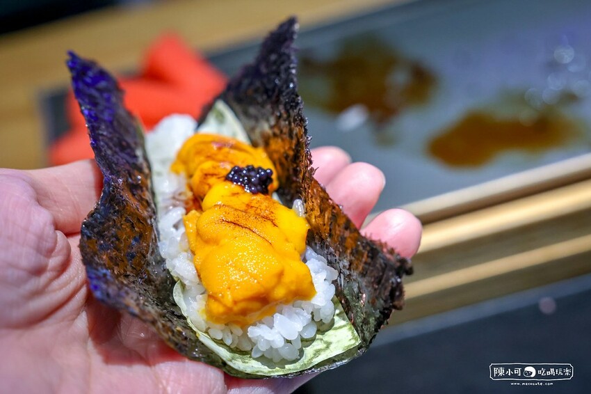 海苔包著北海道有名的磯雪昆布,加上米飯、海膽跟魚子醬,味道濃郁充滿鮮味的新鮮海膽,大口吃下的爽快感讓人意猶未盡,海膽的鮮味停留在口中久久。