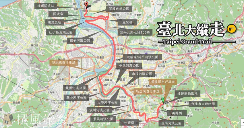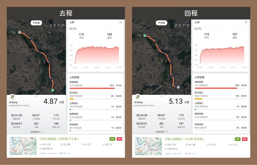我通常在下班後都會去河濱公園慢跑來回各5公里,也就是共10公里(手錶紀錄的配速和距離會有些出入,我以健行筆記紀錄來比較整體的速率),撰風超愛河濱公園騎行或慢跑,大家可以參考我之前寫過的台北大縱走第八段(木柵至關渡),或是之前舉辦相當受歡迎的環騎臺北的活動路線。