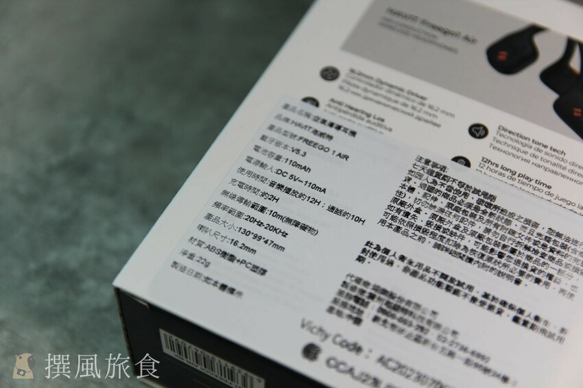 氣傳導耳機通常音質上會比傳統揚聲器的耳機來說差一些,但我很喜歡HAVIT FreegoAir的是他還是有一定的水準(畢竟採用16.2 mm大動圈單體),而且續航力真的還不錯,官網標記可用12小時,撰風測試從下午13:00用最小的音量去播放音樂(最小的音量就很大聲了),一直到晚上20:00都還有電,中間未關機放著到凌晨1:00也都還有電,這個續航完全足夠我使用,而且充電上最多2小時,這個實用性上非常高!
