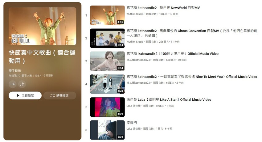 這個YouTube的播放清單是我建立的,我蒐集了一些快節奏的歌曲,這些歌曲就是幫助我提高慢跑水準的工具,像是棉花糖〈馬戲團公約〉、王心凌〈Baby Boy〉、蕭亞軒〈瀟灑小姐〉、FIR〈我要飛〉這類節奏的歌曲我覺得效果都很好。