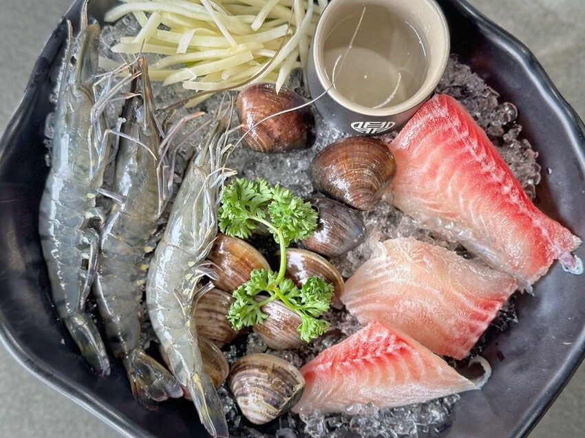 三鮮鍋的海鮮可任選三樣,選擇有草蝦、白蝦、鮮蚵、蛤蜊、魷魚片、鮑魚片、厚切鯛魚片、鮭魚肚、多利魚、小卷,這天我們選擇了草蝦、蛤蜊、厚切鯛魚片。
