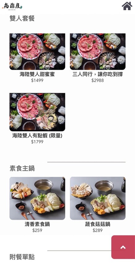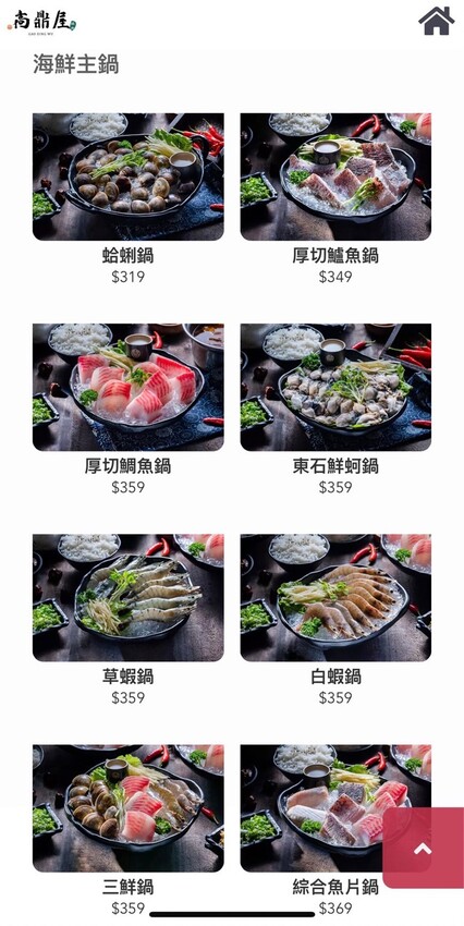 高鼎屋鍋物是採用QR-Code點餐方式,用餐時間為90分鐘,餐點的選擇有肉品、海鮮、素食鍋、雙人套餐、三人套餐、單點等可以選擇,先選主餐接著依序就會有鍋底、副食等選項,滿110公分以上的孩童就須開鍋,高鼎屋鍋物是可共鍋,但會酌收共鍋費。