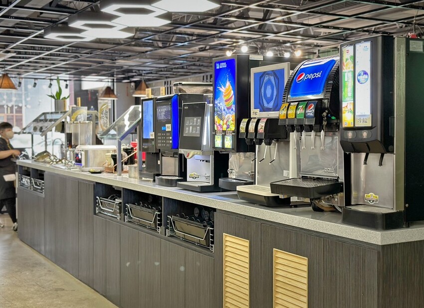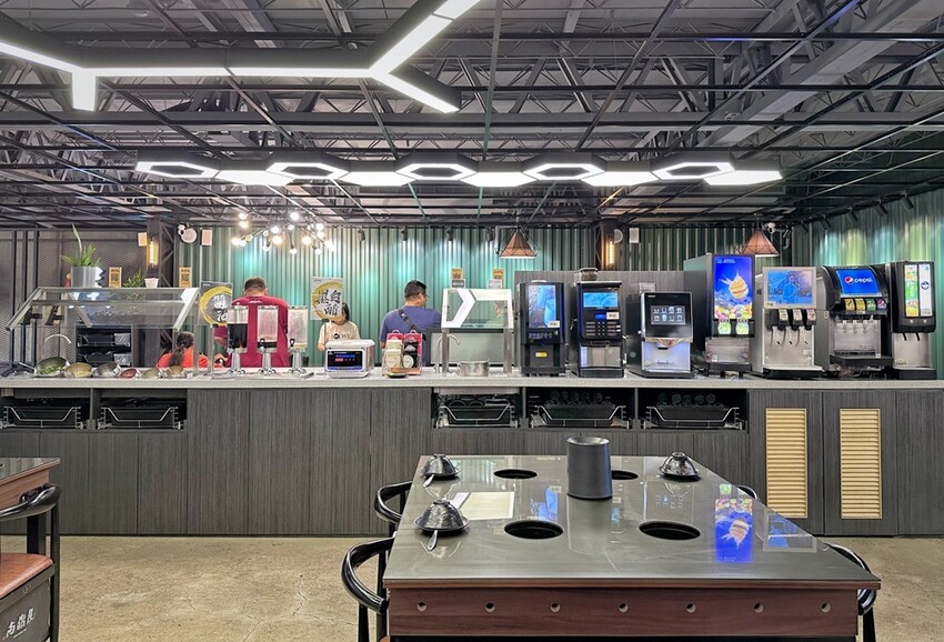 走進高鼎屋鍋物會直接先看到簡約的待位區、商品販售區、櫃台以及冰品自助吧區。接著會直接看到中島區的醬料、甜品、飲品的自助吧區。來訪的這天有感覺飲品有點不行,蔬果姐妹想要喝可樂,按壓出來的飲品竟然不是可樂,反倒像是無糖氣泡水。