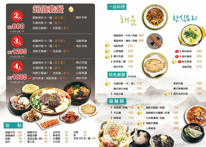 店家提供的菜色十分多元.所想像到的韓式料理.像是海鮮煎餅/山東燒雞/乾烹蝦/辣炒年糕/韓式炸雞/起司蒸蛋/銅板烤肉/石鍋拌飯等~都可以吃的到!