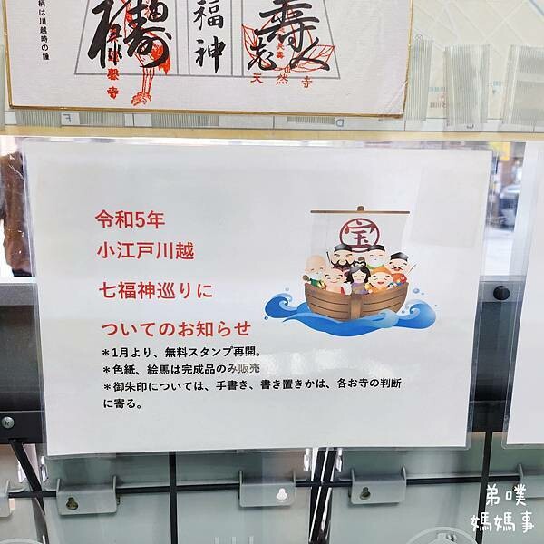 看到這個就很興奮,就決定臨時起意帶著大大小小想要去完成小江戶川越七福神,先說,這的決定是大大錯誤的,當時案內所的工作人員可能也不知道,其實小江戶川越七福神只有每個月1號才能購買及蓋御朱印。但也順勢紀錄也提醒想來奉拜小江戶川越七福神的朋友們,只有每個月一號喔! (其實案內所的公告有說,但因為我看不懂日文,而案內所會說中文的工作人員也沒提醒就多走一趟了...)
