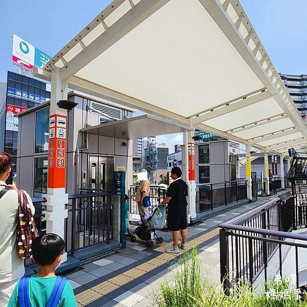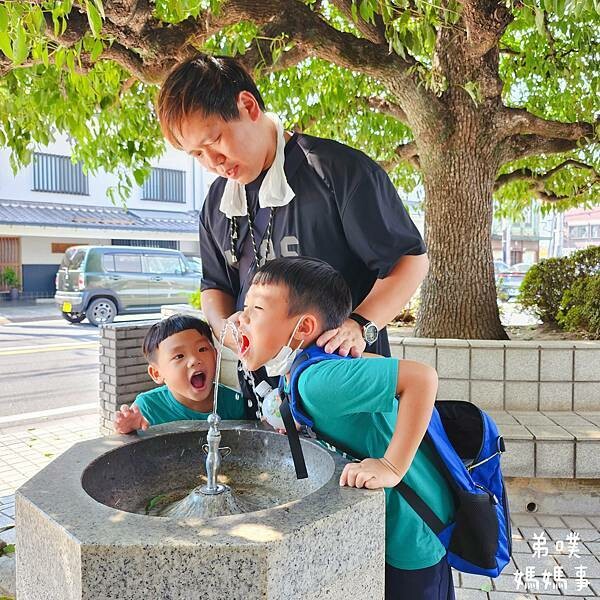 抵達路口,這站我們提早下車,因為想要從最前方路口開始走走看看。一下車就看到日本公園都會有的飲水機。天氣好熱帶孩子嘗試一下,但先說,沒有很順口....這裡還有公共廁所,如果是帶長輩或孩子出門,都還滿推薦在這站下車!