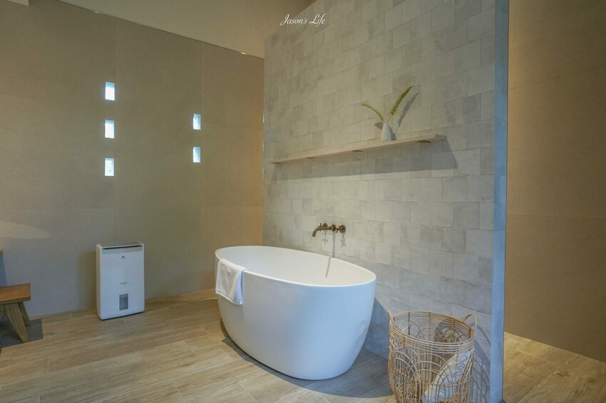 浴室區,備有蛋形浴缸,使用灰色牆面阻隔廁所及淋浴間