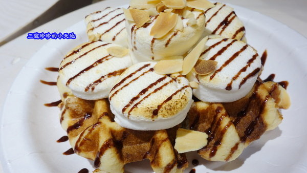 稍微烤過吃起來帶點微酥帶黏的棉花糖,再配上鬆餅一整個絕配嘛~吃起來的口感及味道都相當棒!
