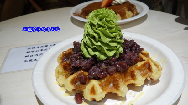 抹茶口味的鮮奶油不會過於甜膩,帶點輕輕淡淡的甜味感,算是在吃鬆餅時能增加鬆餅及紅豆間的滑潤感