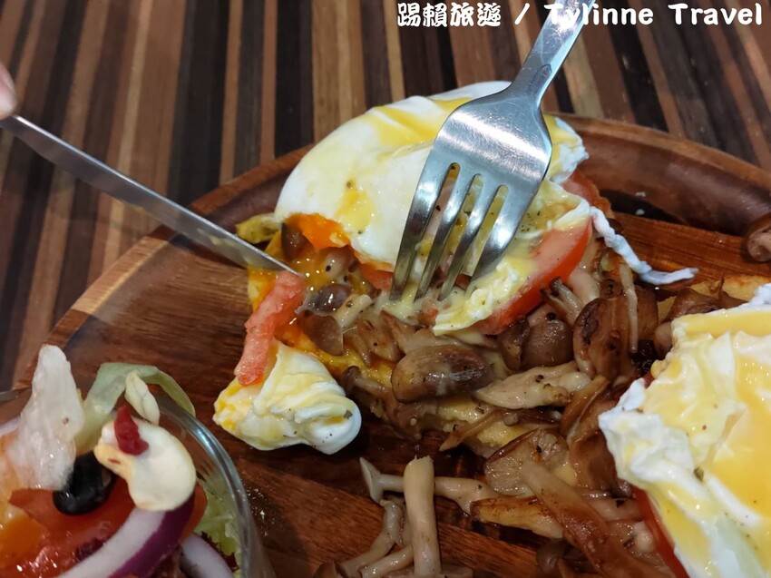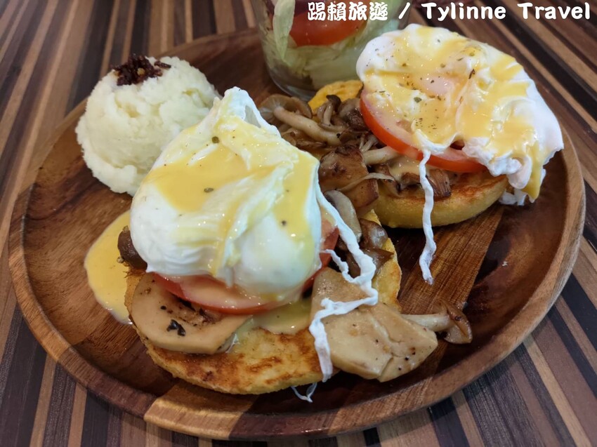 主餐點的是「綜合蕈菇水波蛋」,配菜是「薯泥」跟「生菜沙拉」
