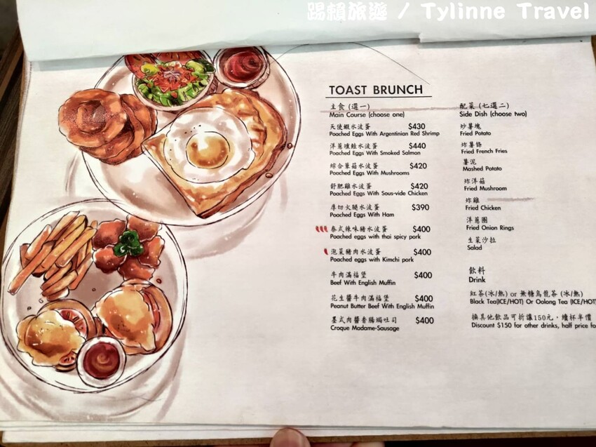 午餐的最大特色就是水波蛋,可以選一個主食跟兩個配菜,還會附一杯飲料